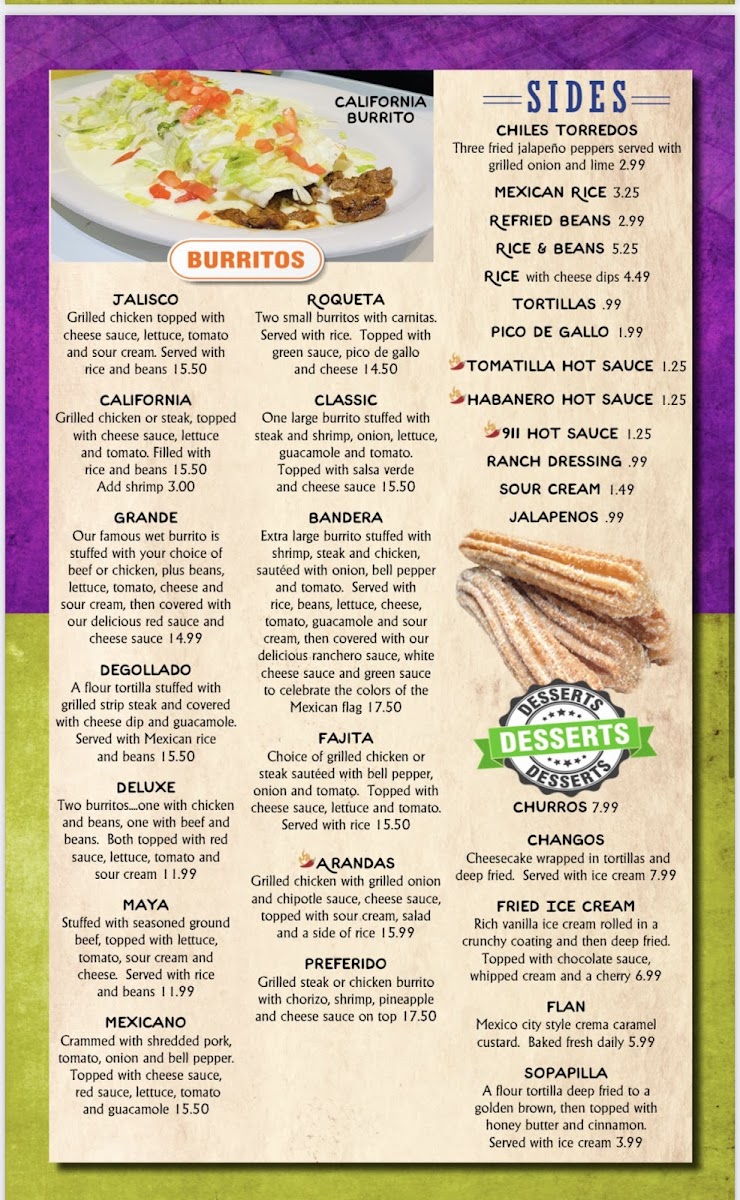 “ When you walk in. It's cool. Decor is unique and I love the seats. All embroidered and very clean. We were greeted quickly. Sat quickly and drinks brought very fast. We each had the lunch special steak burrito. No refried beans. Rice and sub french fries. We did get the cheese dip for the chips. Excellent. Slightly spicy. Salsa is fresh and cold. Steak burrito was excellent. Cheesy and packed with steak strips. Our server constantly checked up on us. Got us fresh drinks and chips and salsa. I always sub my rice and beans for french fries. There french fries were super hot and real. I enjoyed them allot. The rice has corn and peas in it and was also light flavorful. Not sticky or heavy like others. We will be back. A great place to stop and have a bite. Friendly staff. Good food and good deals to be had. You won't leave hungry. Check out a couple pics of the decor :) ”